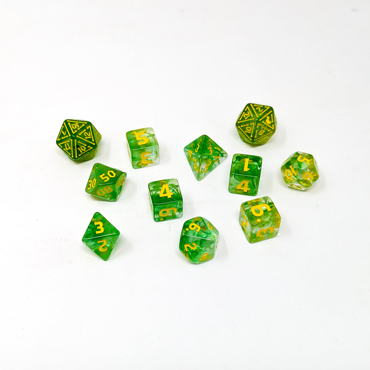 Clear green resin dice with swampy moss embeds.