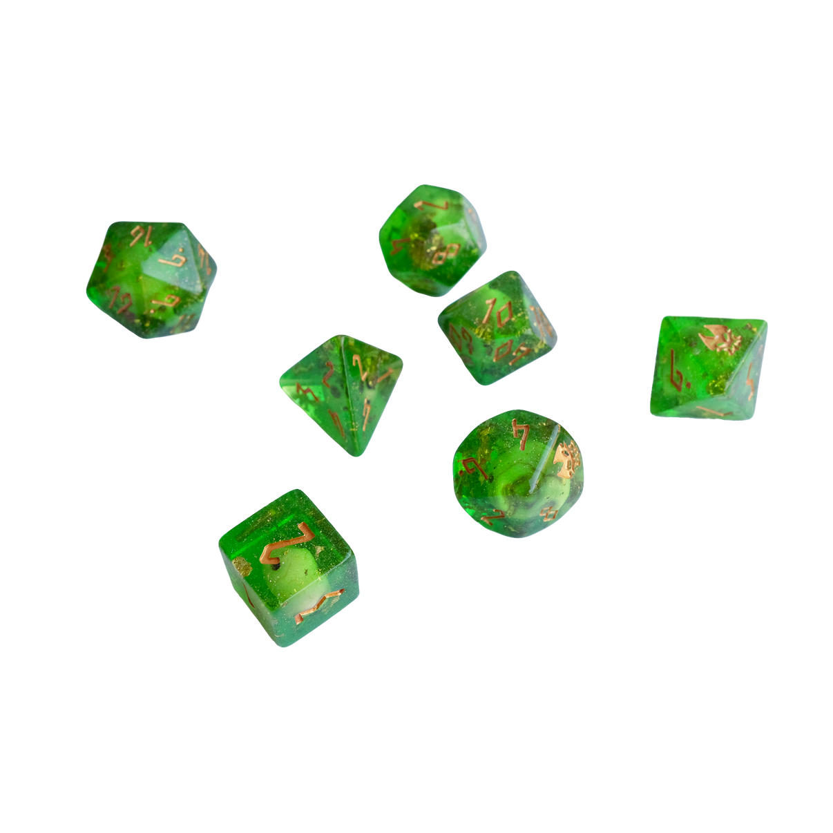 Dice included: one d4, one d6, one d8, two d10s (one percentile), one d12, and one d20.
